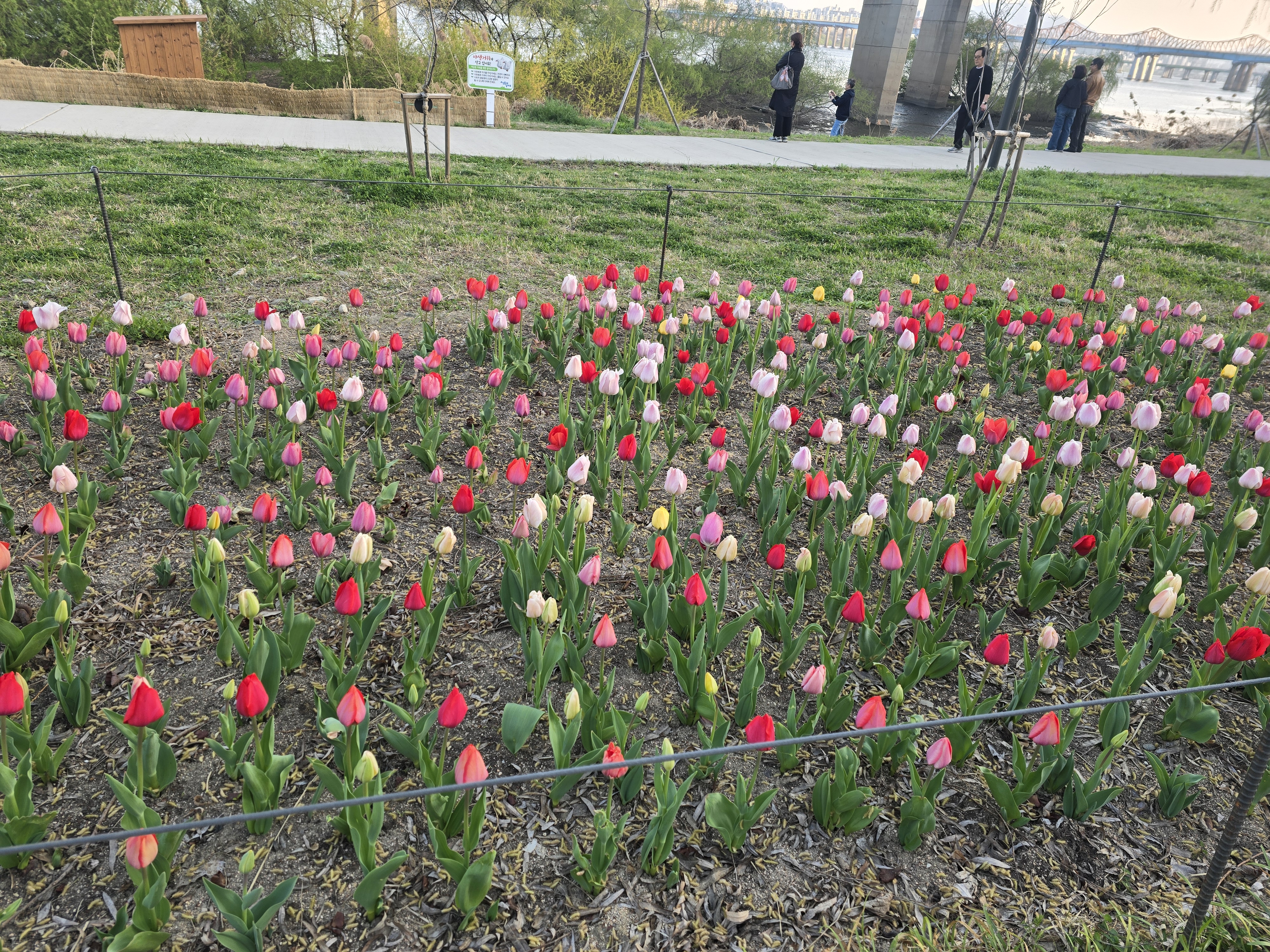 멀리서 보면 대형 캔버스 위에 색채가 입혀진 추상화 같고, 가까이서 보면 하나하나의 꽃잎들이 만드는 정교한 아름다움이 느껴졌다. 한강시그니처 공원의 튤립들이 아직 피어나는 과정 중이라면, 용비휴식정원의 튤립들은 이미 완벽하게 만개하여 그들의 화려한 모습을 유감없이 드러내고 있었다.